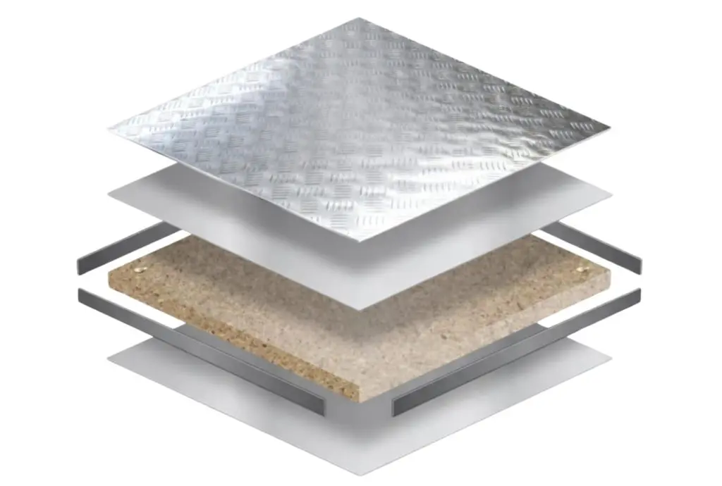 The panel comprises of a galvanised steel top and bottom sheet that are bonded to an FSC® certified, high density particle board core for greater strength and durability, this then has 3mm aluminium chequer plate bonded and screwed onto the top of the panel, then the panel is finished with a full edge banding. It is designed to be gravity laid with complete electrical continuity and has a high resistance to damage.