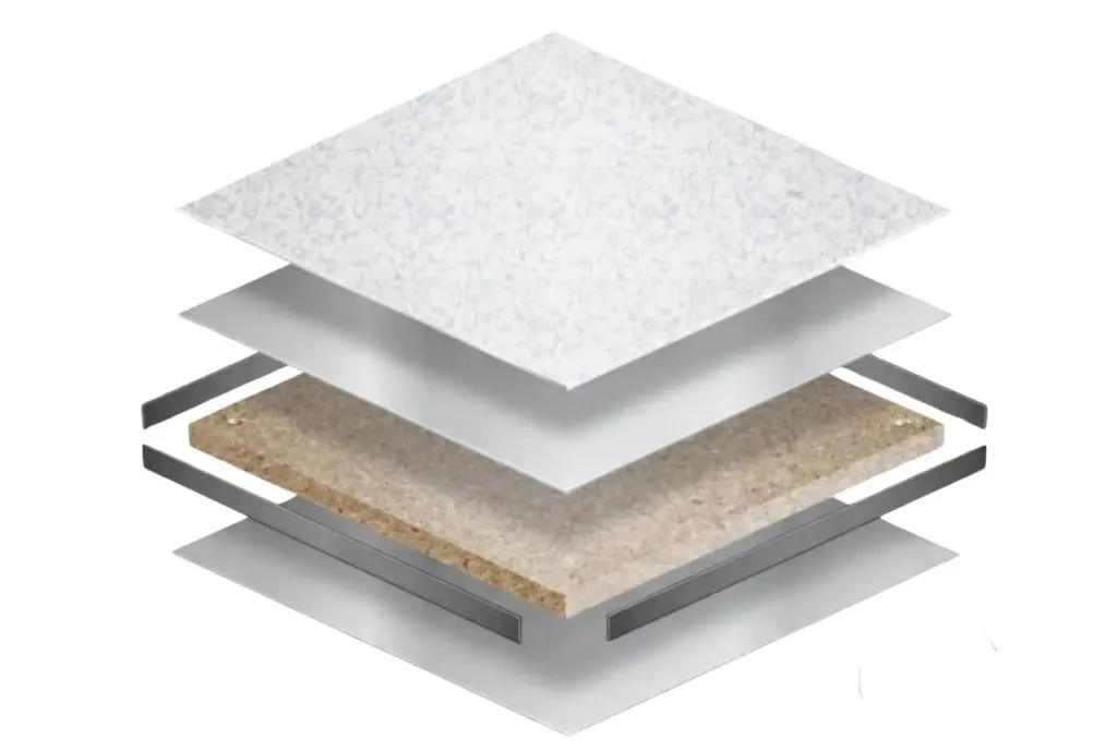 The panel comprises of a galvanised steel top and bottom sheet that are bonded to an FSC® certified, high density particle board core for greater strength and durability, this then has customer approved laminate, factory bonded onto the top of the panel, the panel is then finished with a full depth ABS edge banding. It is designed to be gravity laid with complete electrical continuity and has a high resistance to damage.