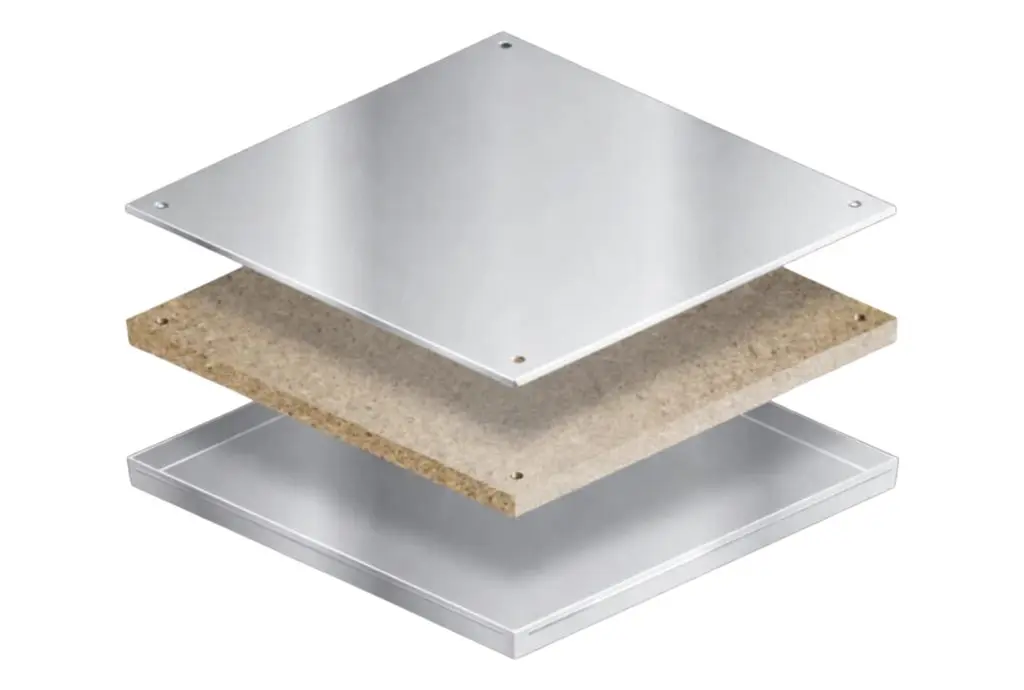 The fully encapsulated panel comprises of a steel top and base plate that are adhesive bonded and mechanically pressed around an FSC® certified high density particle board core for greater strength and durability. It is designed to be screwed down with complete electrical continuity and has a high resistance to damage.